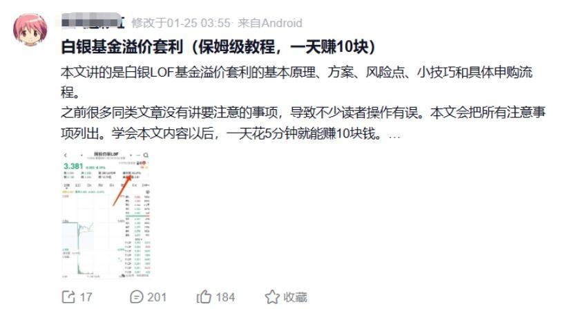 与此同时,网上开始出现众多关于该基金的套利“课程”,进一步加速资金进场。其间,国投白银LOF场内价格溢价率一度突破50%,即如果套利成功,投资者在场外以净值申购该基金,然后在场内卖出,最高获利可超过50%。