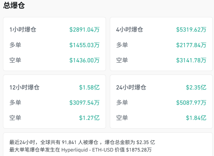 加密货币持续反弹,截至22:48,比特币重返8.9万美元上方,近24小时内以太坊、SOL、XRP涨幅均超2%,狗狗币涨超10%。全球超9万人被爆仓,爆仓总金额2.35亿美元,其中超78%为空单爆仓(1.84亿美元)。