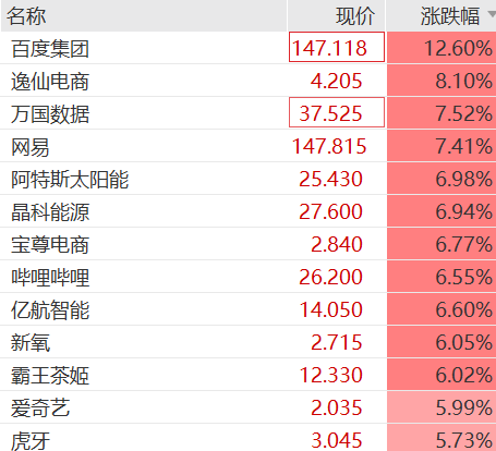 中概股集体爆发,纳斯达克中国金龙指数涨近3.9%,百度继盘前涨12%后,开盘即狂飙超12%,今日百度港股也收涨超9%。消息面上,百度旗下昆仑芯已向港交所提交主板上市申请。此外,逸仙电商涨超8%,万国数据、网易、阿特斯太阳能、晶科能源等涨7%左右, 哔哩哔哩、霸王茶姬、爱奇艺涨6%,阿里巴巴涨超4%。